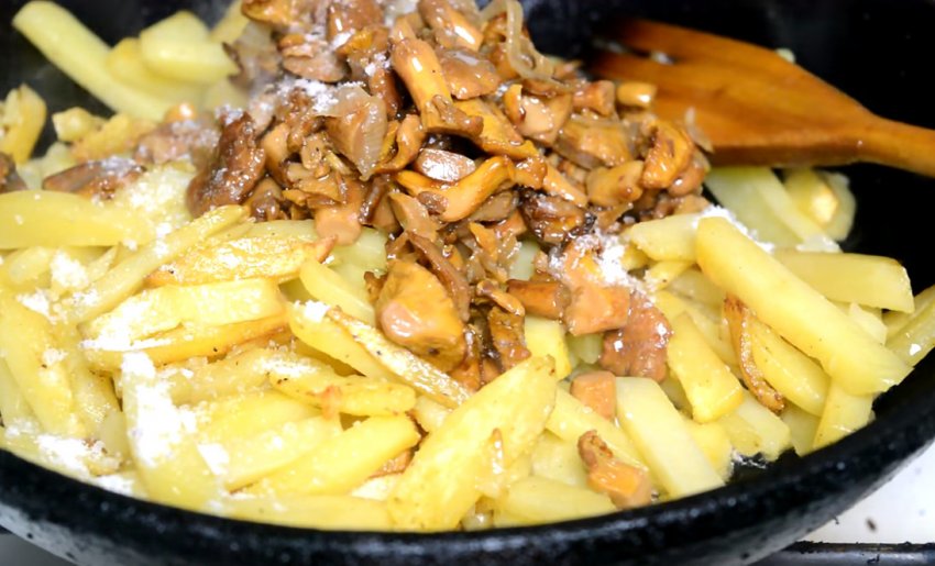 Додати гриби до картоплі, помішуючи 10 хв, рум'янити до золотистого кольору.![]()