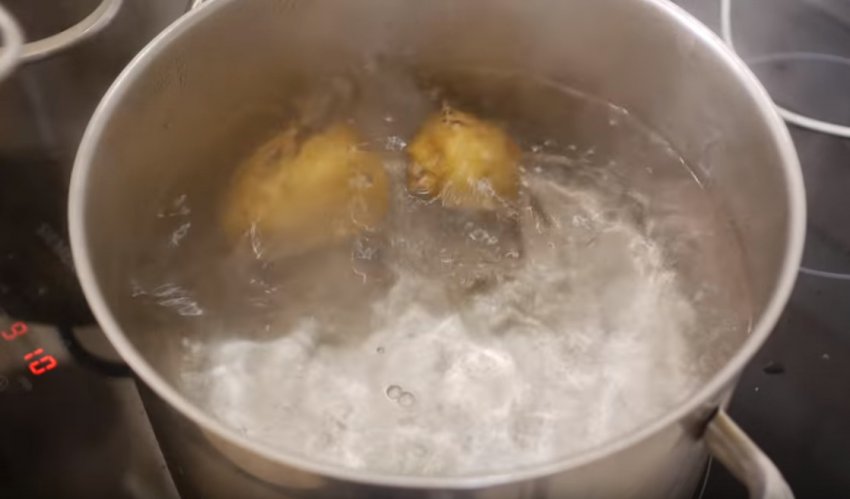 Як вода закипить, опустити миту картоплю в шкірці. Варити 12-15 хв. (рідину злити).Гриби відкинути на друшляк, акуратно викласти, щоб просохли.![]()
