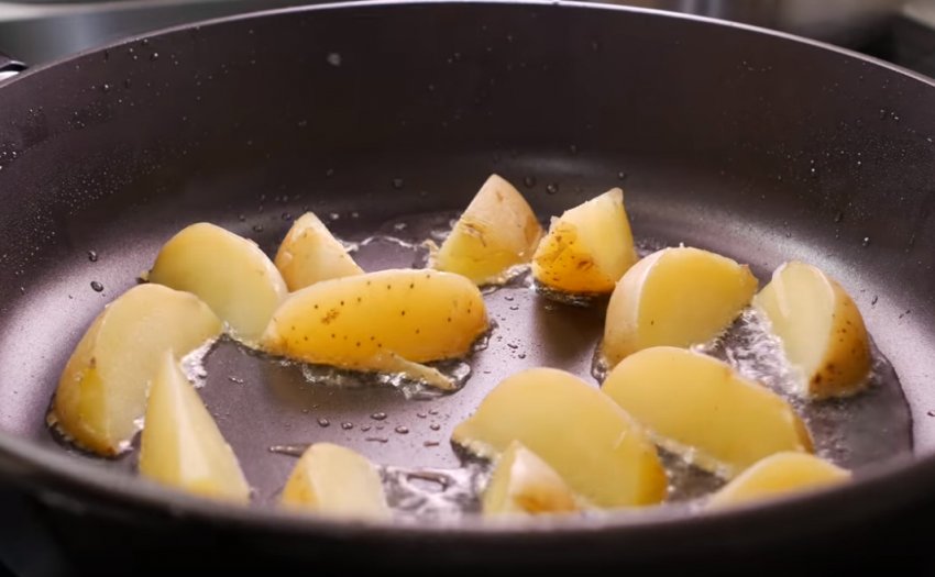 Відварену картоплю порізати часточками. Підсмажити на великому вогні до рум'яної скоринки.![]()