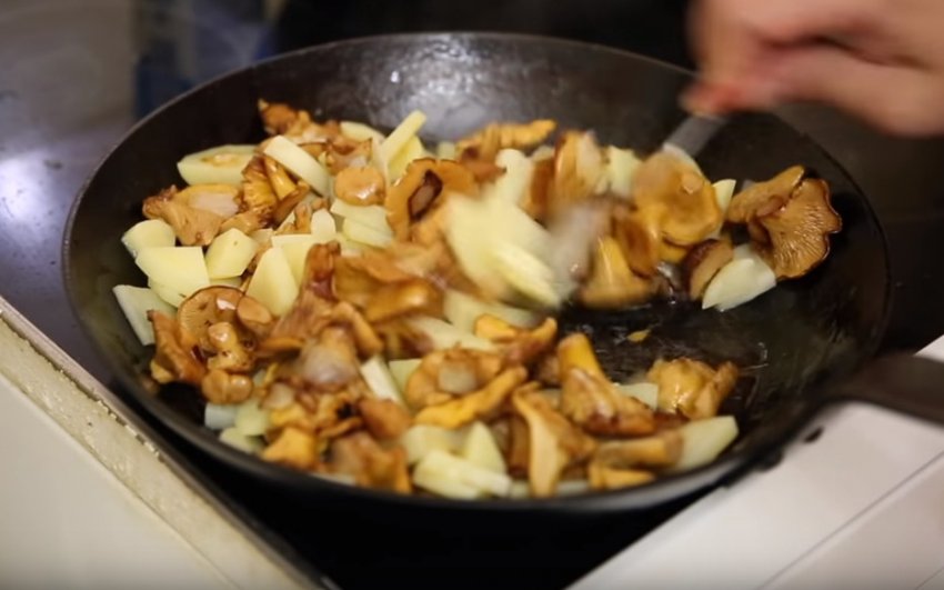 Лисички пересипати в посудину. Розігріти сковороду, на олії обсмажити картоплю.![]()
