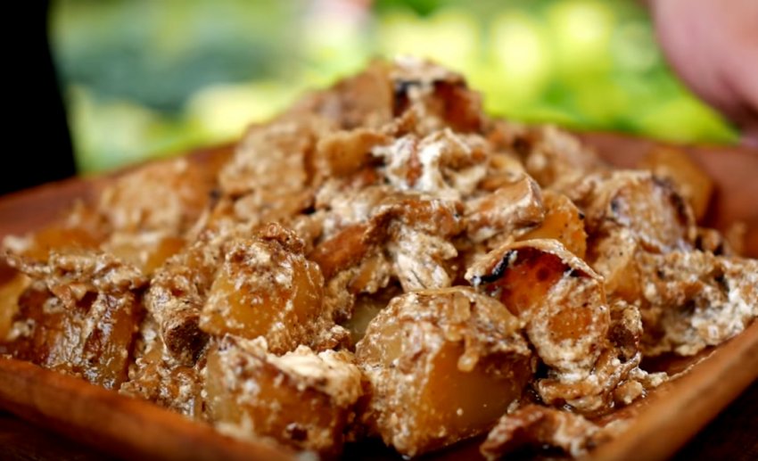 Додати сметану, посолити, перемішати, дати закипіти. Томити під кришкою 5 хв. (до повної готовності картоплі). Дати настоятися під кришкою.![]()