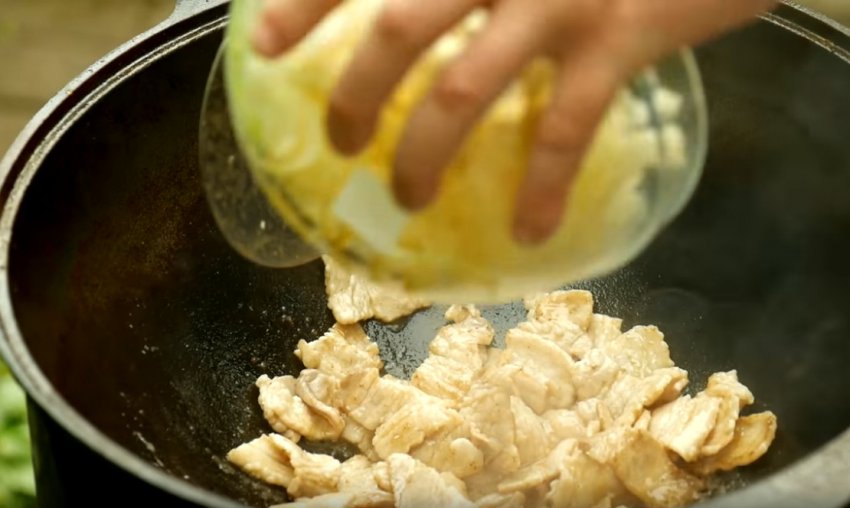 Закинути бекон у сильно прогрітий казан, постійно перемішувати.![]()