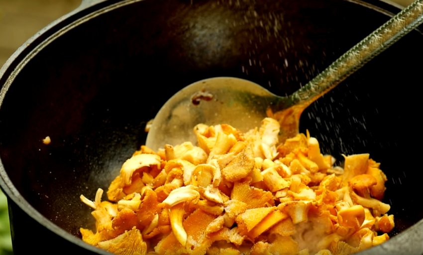 При появі жиру додати цибулю, обсмажувати протягом 5 хвилин. Засипати лисички, посолити за смаком. Помішати лопаткою. Смажити 10 хв., після чого все, крім жиру, прибрати з казана.![]()