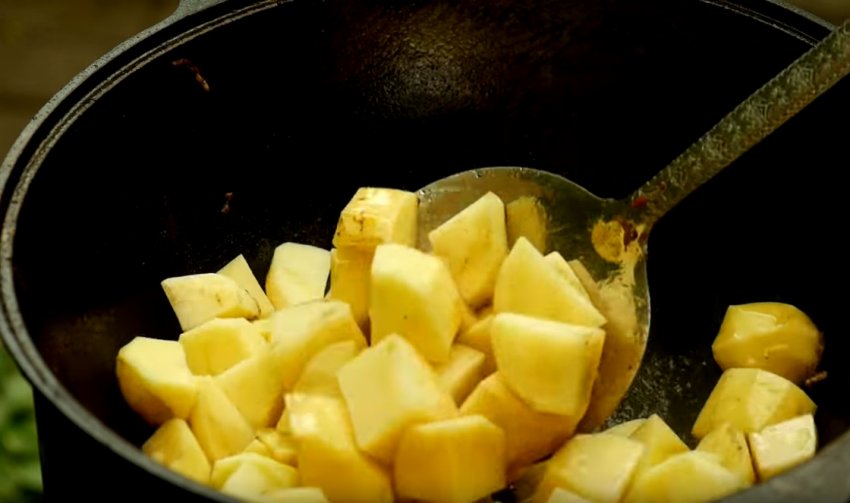 Пересипати картоплю в казан, обсмажувати, перевертаючи, близько 7 хв. Посолити, поперчити.![]()
