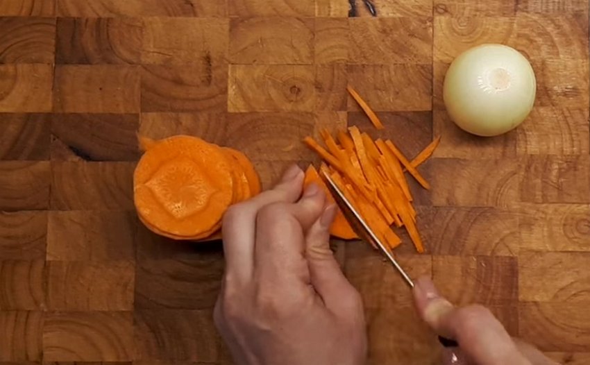 - Моркву подрібнити на тертці, а цибулю дрібно покришити.