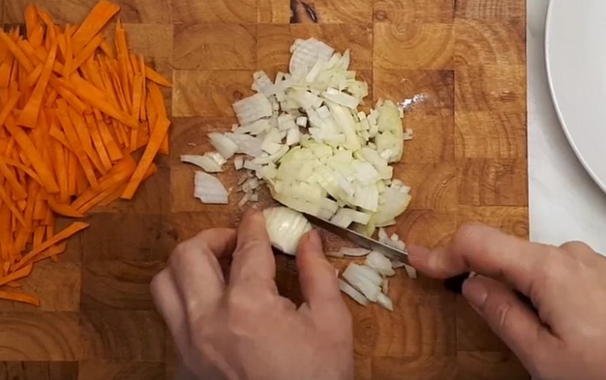 - Ретельно помити цибулю з морквою і очистити, а після подрібнити на невеликі кубики.