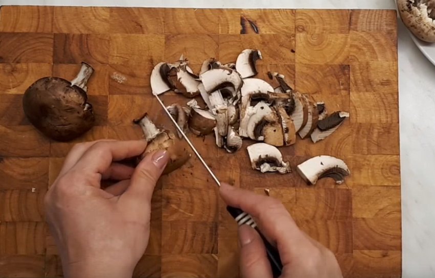 - Печериці розморозити, ретельно помити і накришити невеликими шматочками. Кинути в окріп і проварити близько 15 хв. Зняти піну, вийняти печериці та перекласти в іншу ємність.