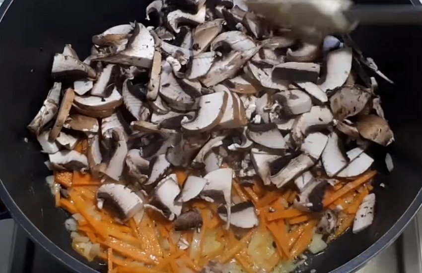Просмажити в олії морквяно-цибулеву суміш і всипати гриби.![]()