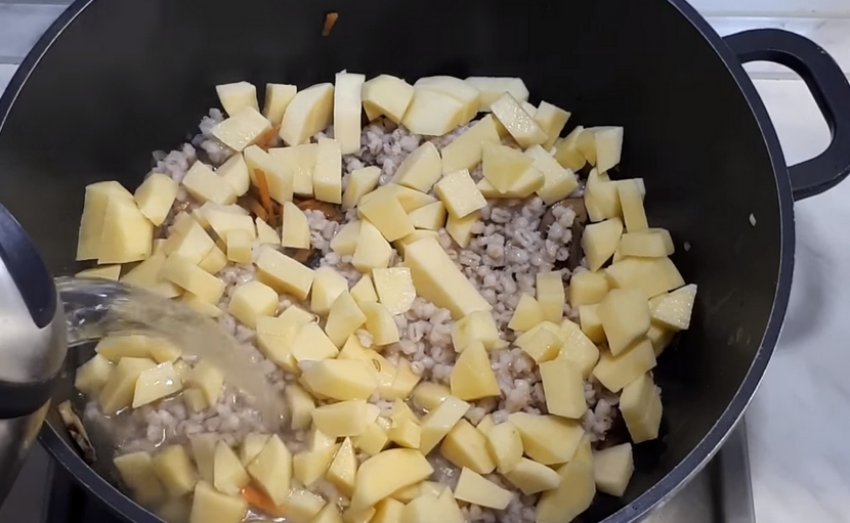 У підсмажені овочі додати перловку, картоплю і залити гарячою водою.![]()