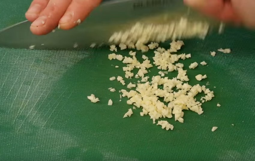 - Часник нарубати дрібними кубиками, цибулю нарізати вздовж.