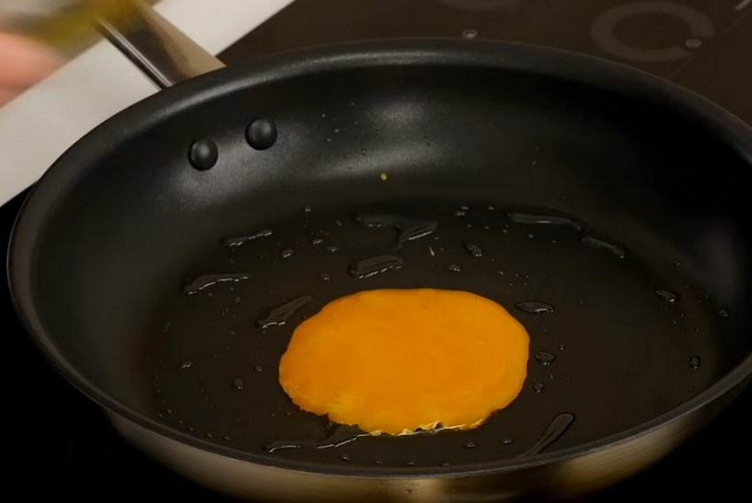 сотейнику нагріти 10 мл соняшникової олії, збити віночком або виделкою жовток із дрібкою солі, підсмажити.![]()