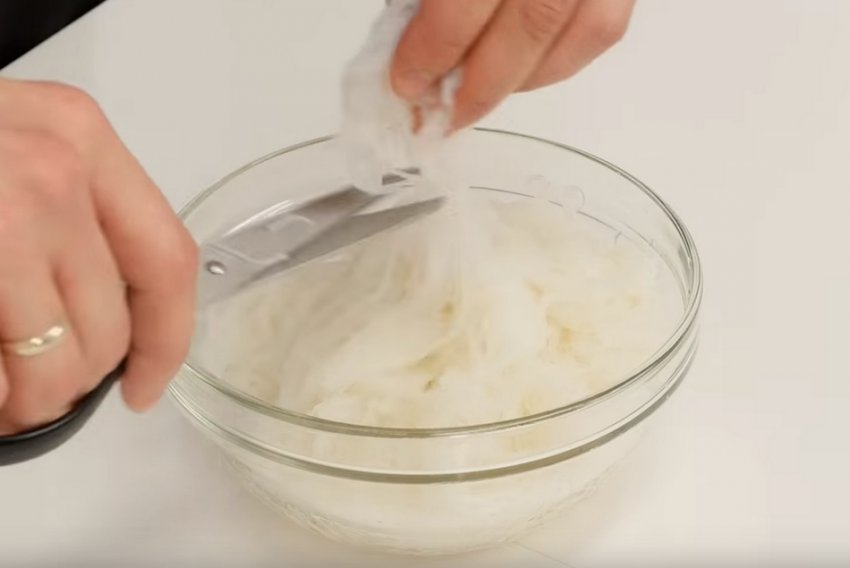 - Із фунчози злити зайву рідину. Нарізати ножицями на шматки завдовжки 8 см.