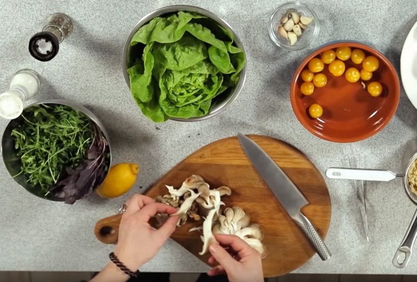 Зі смаженими гливами, кіноа та копченою куркоюВидео-рецепт: Зі смаженими гливами, кіноа та копченою куркою