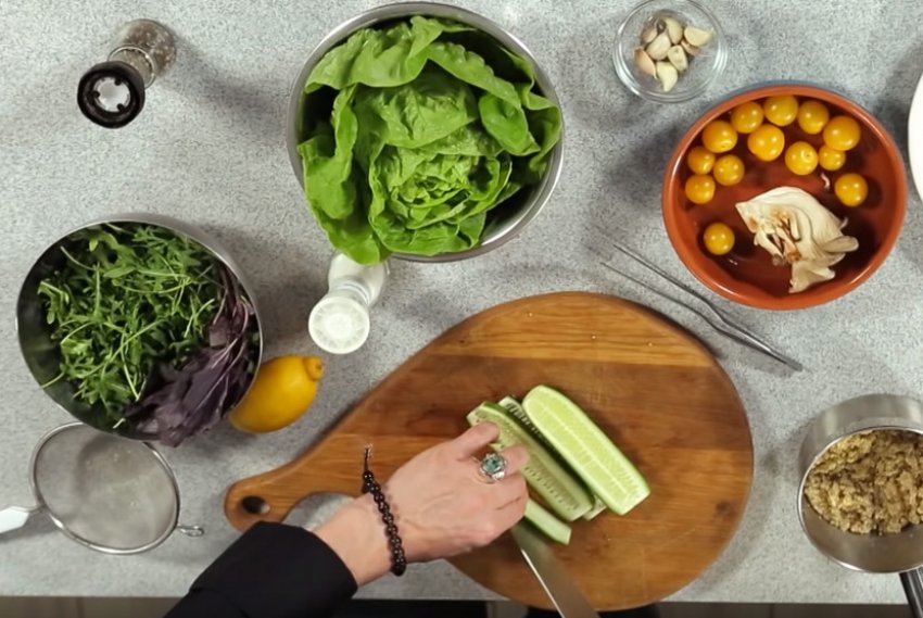 Дрібно посікти огірок, руколу і додати у відварену крупу. Посолити, заправити оливковою олією та соком лимона. Перемішати.![]()