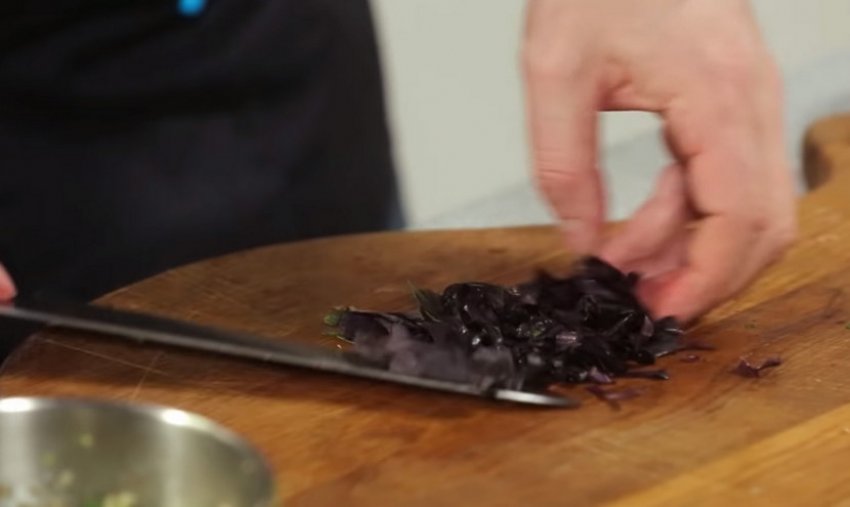 Нарізати листя червоного базиліка великою соломкою і додати до суміші з кіноа, не перемішувати.![]()