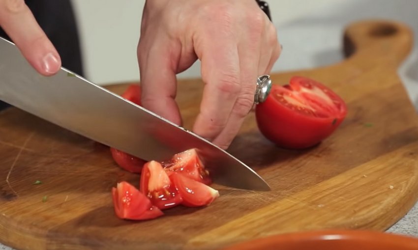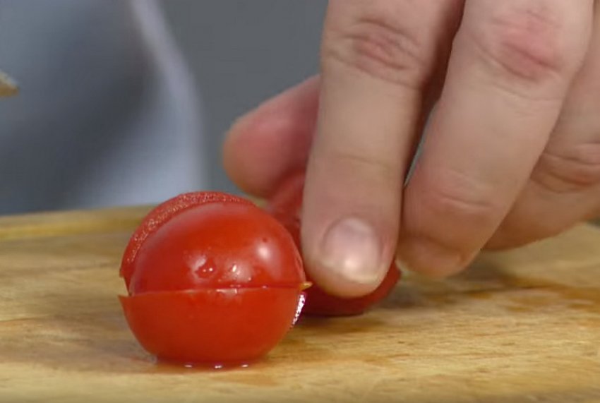 Кожен помідор розрізати на 4 частини і додати до теплих грибів.![]()