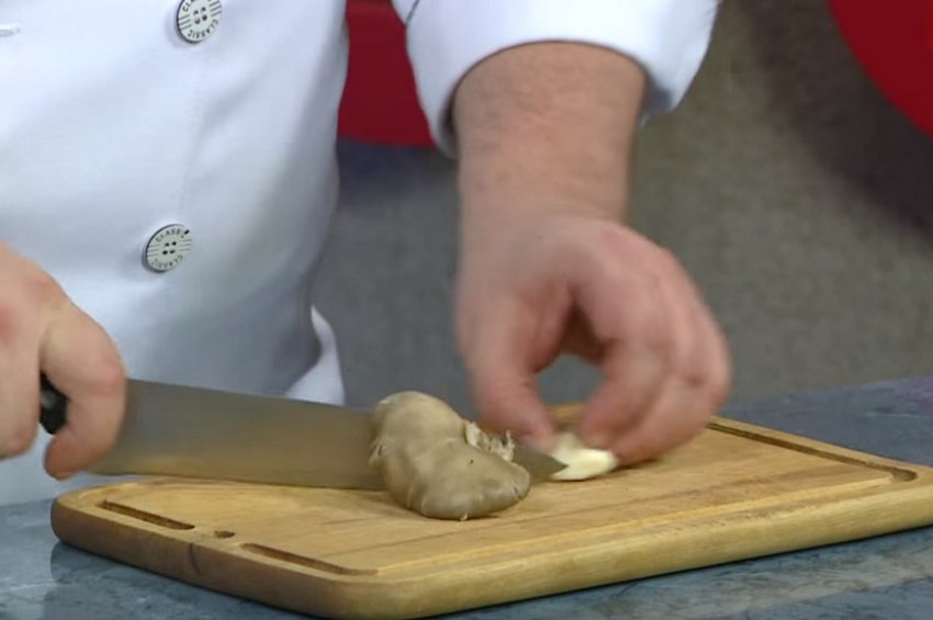 На розігріту сковорідку налити олію і додати роздавлений часник. Викласти гливи, посолити й обсмажити до рум'яних підпалин.![]()