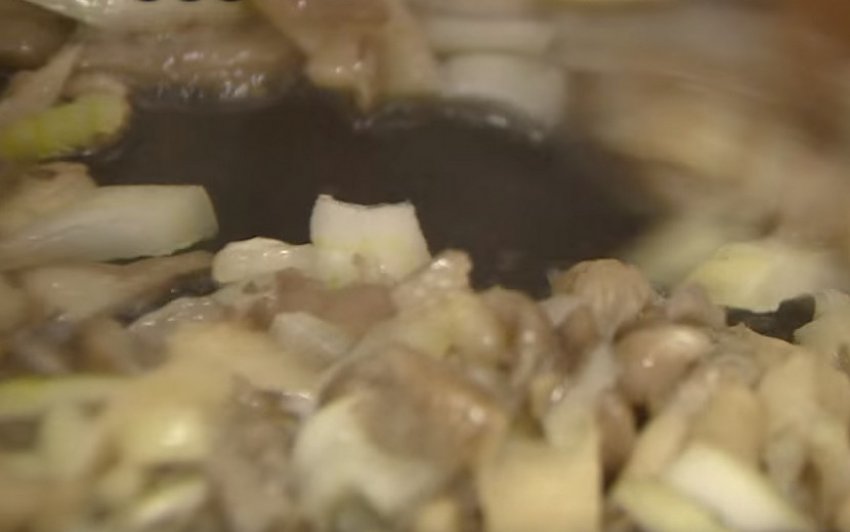 - Цибулю настругати півкільцями й обсмажити на олії до напівготовності, потім викласти туди ж гриби та смажити на середньому вогні. Коли рідина піде, додати сіль і перець за смаком.