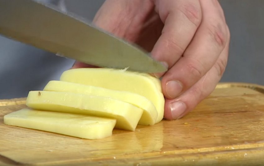 - Відварену картоплю і яйця круто, а також огірки нарізати кубиками.