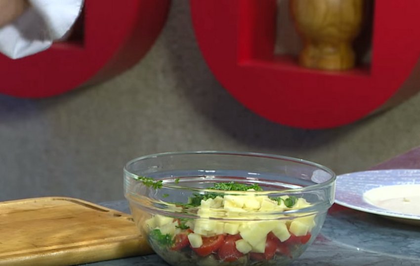 Теплий салат із сиром і помідорамиВидео-рецепт: Теплий салат із сиром і помідорами