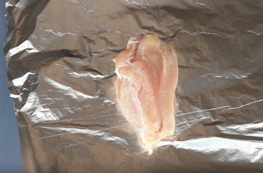 На розстелений аркуш фольги викласти курячу грудку, посолити і загорнути у фольгу. Викласти в розігріту до +200° духову шафу і запікати 20-30 хвилин. Готове філе остудити і розібрати м'ясо на волокна.![]()