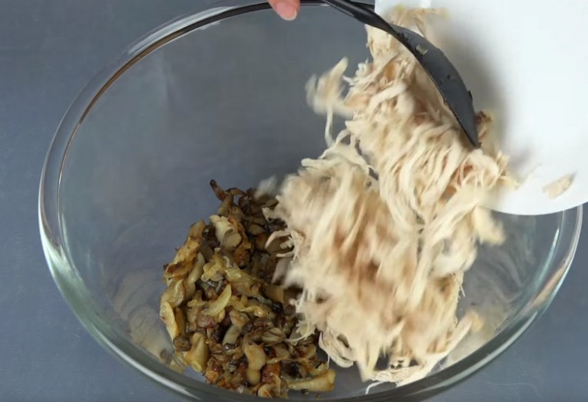 Викласти в ємність грибну суміш, нарізаний огірок, м'ясо і яйця. Заправити майонезом і добре перемішати. Перекласти в посуд для подачі.![]()