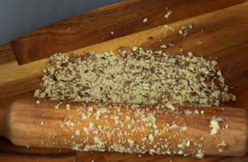 Волоські горіхи подрібнити качалкою або дрібно порубати ножем. Посипати горіховою крихтою готовий салат.![]()