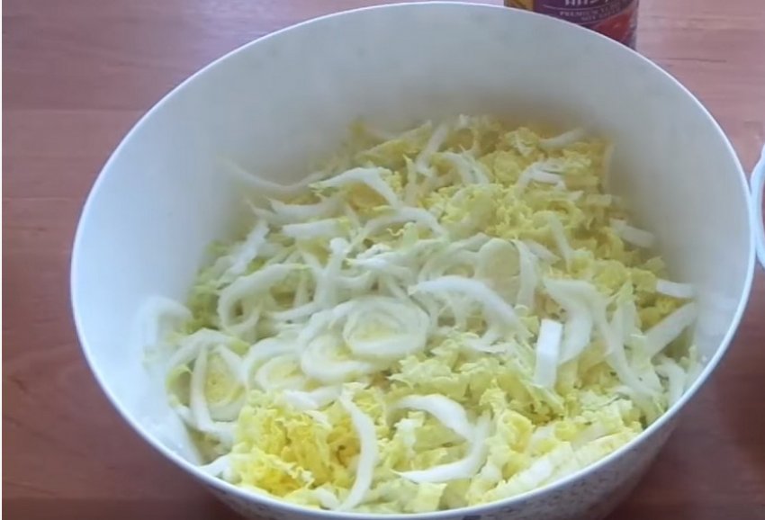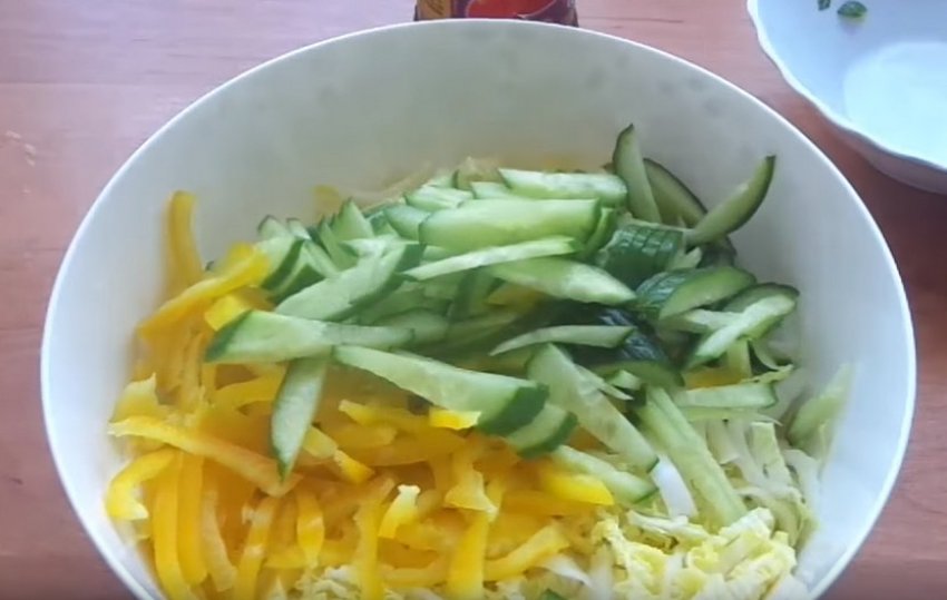 Дрібно настрогати пекінську капусту. Перець і огірок нарізати соломкою.![]()