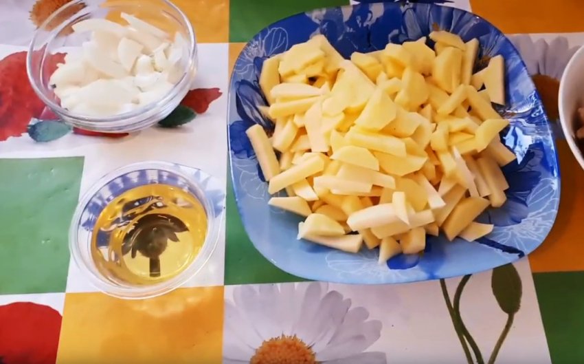 Очищену картоплю нарізають на невеликі бруски, які завтовшки не перевищують 1 см, висипають у тарілку і залишають на деякий час.![]()