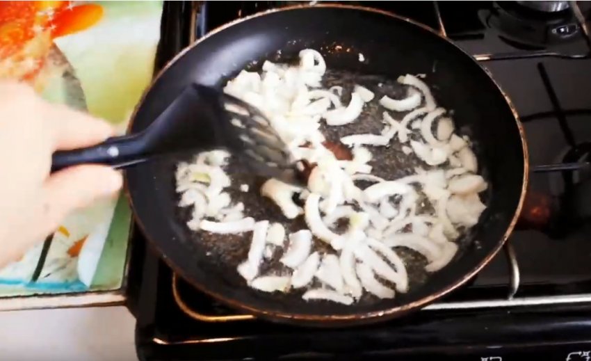 Цибулину шаткують не товстими півкільцями або чвертькільцями, як більше подобається кулінару.Сковороду з налитою на дно олією розігрівають на помірному вогні, після чого висипають туди нашатковану цибулю і залишають смажитися протягом 3 хв.![]()