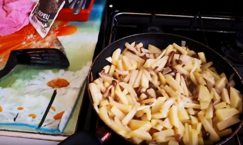 Ємність зі стравою, що готується, накривають кришкою, щоб картопля з опеньками добре приготувалася і набула м'якості. Періодично сковороду необхідно відкривати, а її вміст перемішувати. Через 10-15 хв. смаження страва готова.![]()