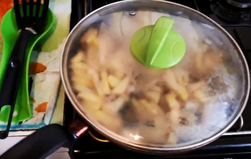 Глибоку товстостінну сковорідку встановлюють на плиту і вмикають сильний нагрів.![]()