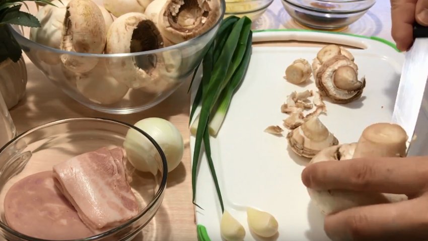 Найбільшою проблемою в підборі компонентів страви можуть стати саме печериці. Свіжі гриби можна застати лише в певний час у супермаркеті, а лежані втрачають не лише зовнішній вигляд, а й смакові якості. Тому вибирати необхідно тільки великі та яскраво-білі екземпляри. Оскільки гриби принесені з магазину, кухареві залишається їх тільки промити під сильним напором води.
