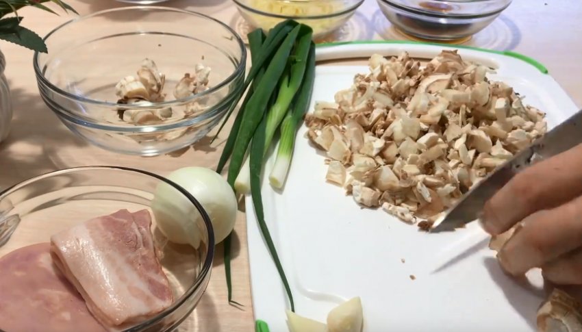 Також дрібно нарізається зелена та ріпчаста цибуля. Аналогічним способом подрібнюють шинку та бекон, часник.![]()