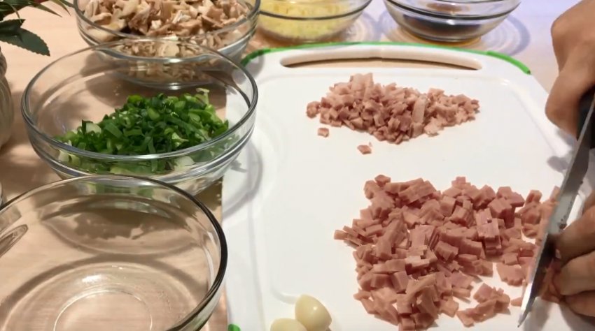 Поки смажаться печериці та цибуля, нарізають шинку дрібними кубиками. Поміщається в глибоку тарілку.![]()