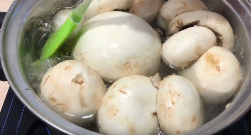 Перед фаршируванням, капелюшки печериць відварюють у киплячій підсоленій воді протягом 2 хв. Після дають охолонути.![]()