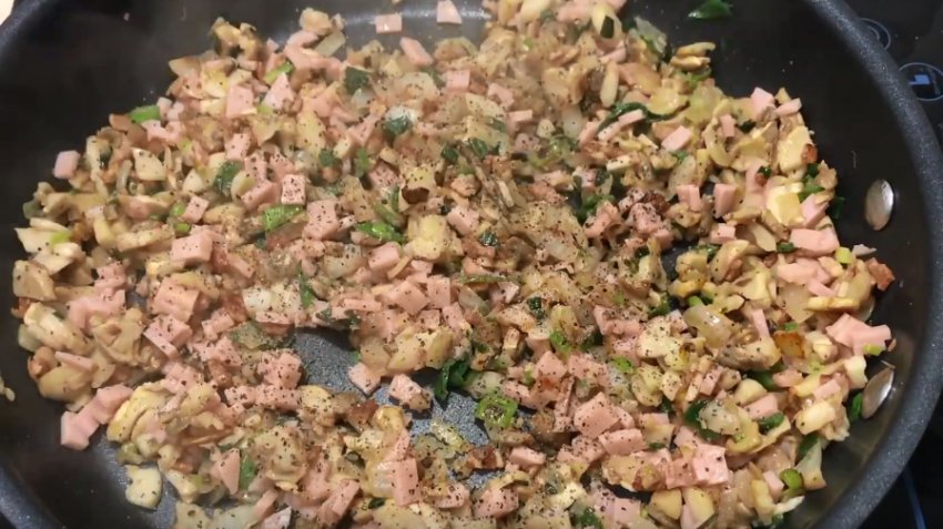 У цей час на плиті розігрівається сковорода з рослинною олією. На неї висипають раніше нарізані інгредієнти для начинки. Уся суміш прожарюється близько 5 хв. Сюди ж можна додати улюблені спеції.![]()