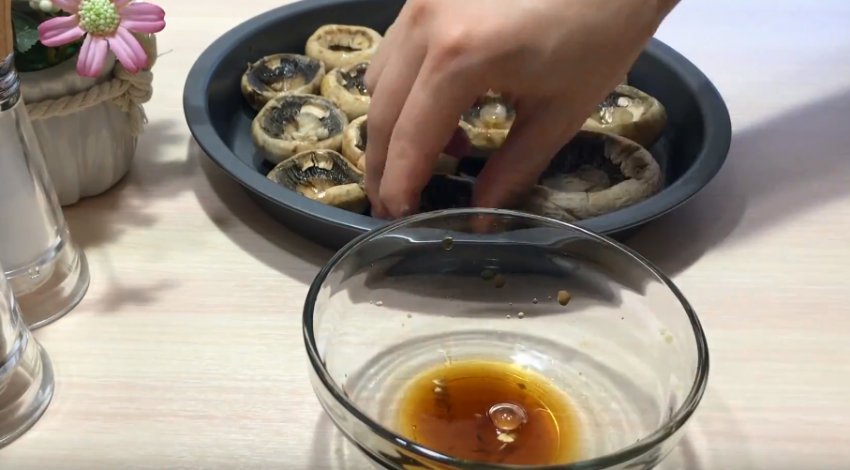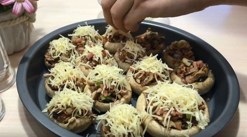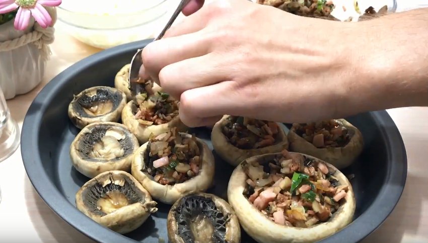 Форма для випікання змащується рослинною, оливковою або вершковою олією. Капелюшки грибів, за допомогою чайної ложки, наповнюються сумішшю цибулі, шинки, ніжок печериць і часнику.![]()