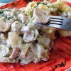 - Смажену картоплю додати в сковорідку з грибами, ввести вершки та сметану, ретельно, але акуратно перемішати й тушкувати 10-15 хвилин на повільному вогні під кришкою.