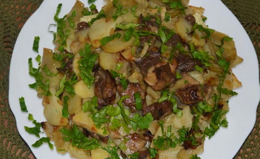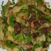 - Проварені гриби та сиру картоплю одночасно покласти в підігріту пательню з олією і смажити за рідкісного помішування протягом 20 хвилин.