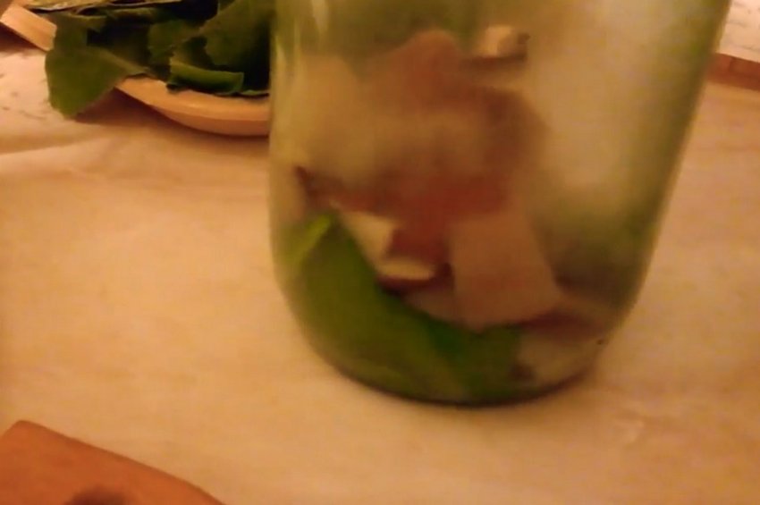 - Покладіть заготовки в таз, додайте до них сіль, розмістіть і розкладіть у знезаражені банки. Зверху ще раз присипте сіллю.