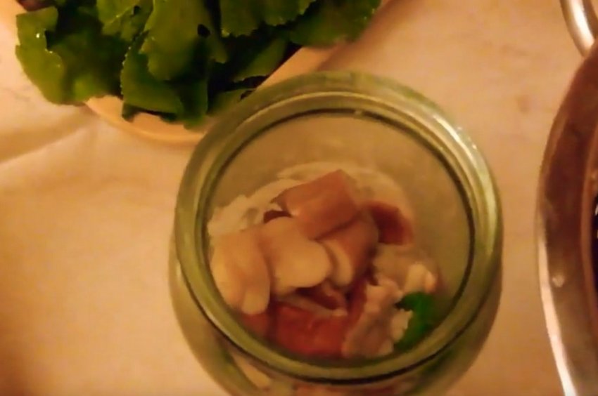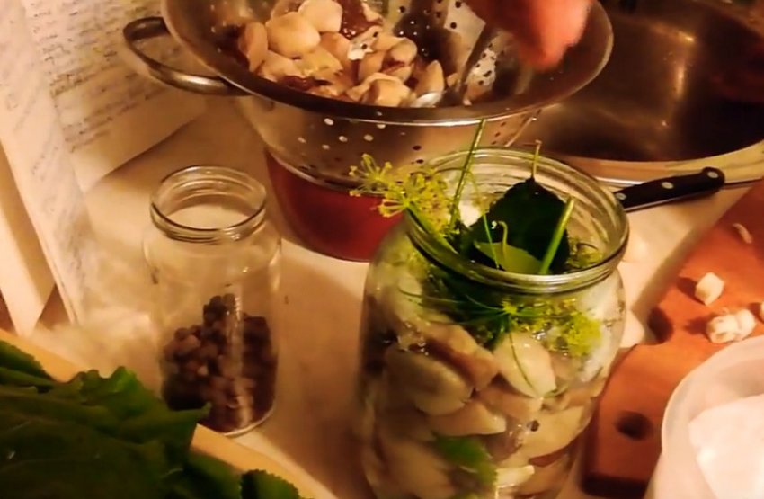 - Заповнюйте посуд плодами у вигляді шарів, перекладених розчавленими часниковими часточками, кропом, пряними листами. На кілограм грибів потрібно близько 1,5 повних ложки солі. На дно викладайте більші шматки або капелюшки.