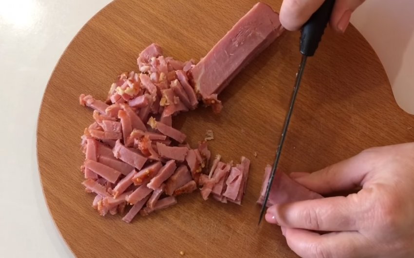 Подрібніть шинку і огірки до дрібної соломки.![]()