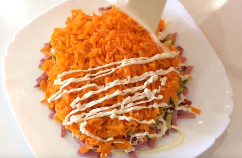 На широкій і глибокій тарілці шарами покладіть: шинку, огірки, моркву, картоплю і яйця. Усі шари при цьому потрібно солити за смаком і щедро перемащувати майонезом.![]()