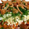 Покладіть зверху салату зелень, а потім гриби. Страва не потребує настоювання і готова до подачі відразу після приготування.![]()