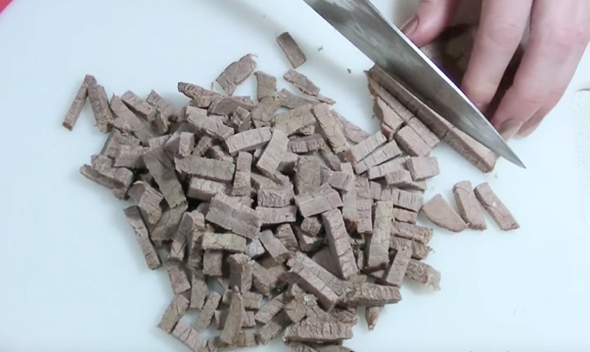 - М'ясо, яйця, моркву слід відварити до повної готовності, а потім остудити. За необхідності також потрібно приготувати і м'ясо, для цього його потрібно варити не менше 30 хвилин.