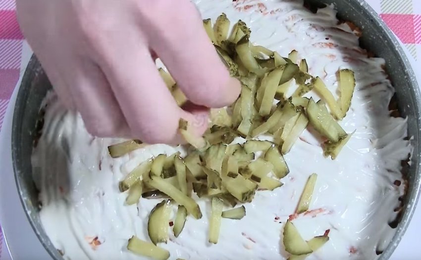 Візьміть глибоку форму для запікання з роз'ємним бортиком і покладіть продукти шарами: картопля, яловичина, цибуля, морква, огірки, яйця. Шари потрібно обов'язково перемазувати майонезом і солити за смаком.![]()