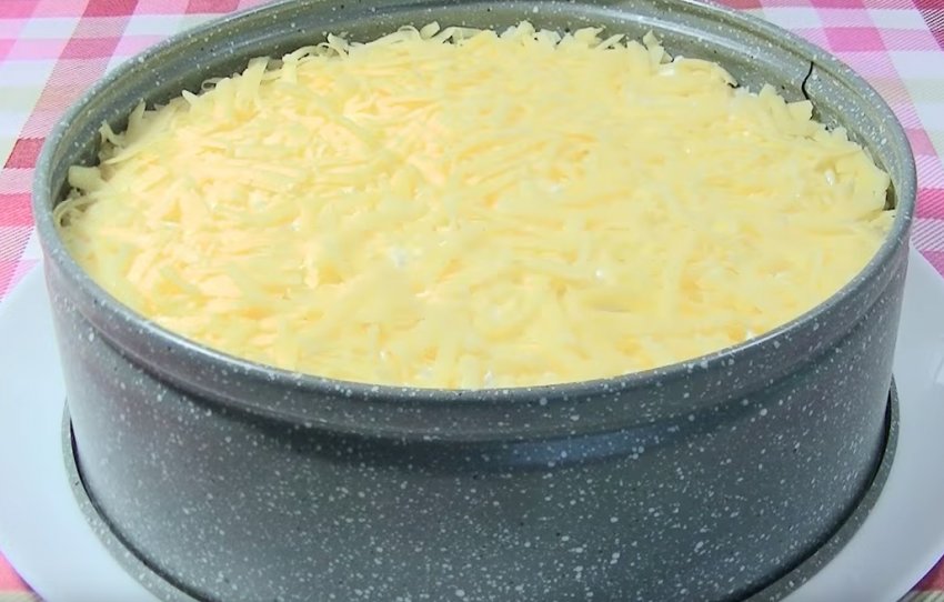 Помістіть на яйця подрібнений сир, злегка ущільніть його. Перенесіть страву в холодильник для настоювання на 2 години.![]()
