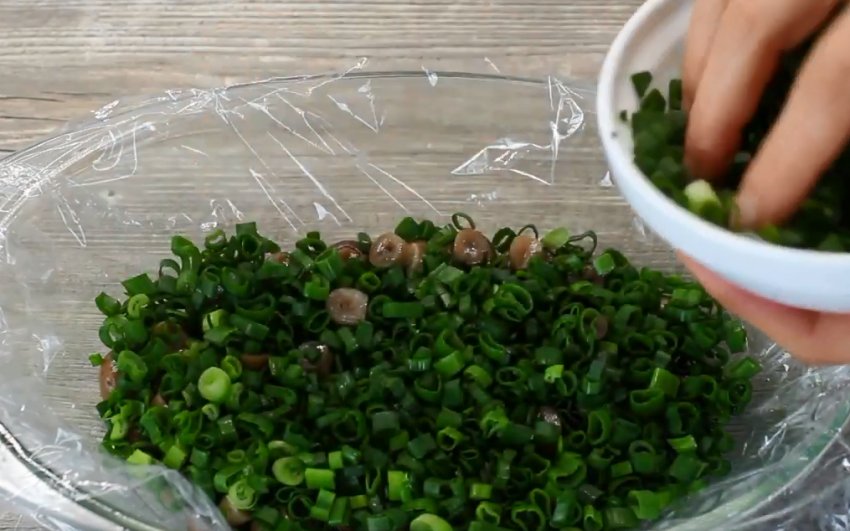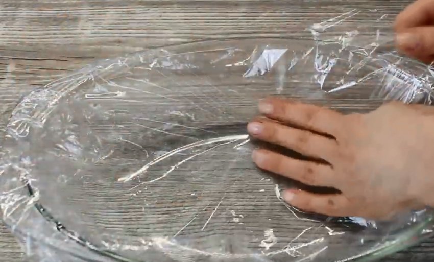 Візьміть глибоку салатницю, застеліть її харчовою плівкою.![]()