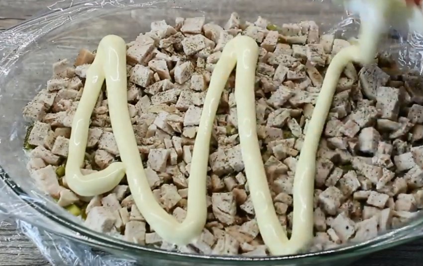 Викладіть шарами інші продукти в такій черговості: картопля, огірки, куряче філе, кукурудза, яйця. Усі шари потрібно обов'язково перемазувати майонезом і солити.![]()